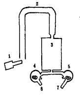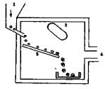 图3 静电法装置模型图 1-静电消除器;2-冷却器;3-加热器; 4-蜡;5-甘油;6-负电荷;7-正电荷。 资料来源: Food Eng., 1966,No.2,136 六、真空硬化法 本方法利用金属真空电镀的原理,即在真空中将外膜物加热成蒸气,附着在内芯物的表面上,冷却后固着形成微胶囊。 本法中所用内芯物是固体,在真空高温中必须稳定,没有变化。又外膜物采用铝等金属、蜡质、石蜡等物。本法装置模型见图4。