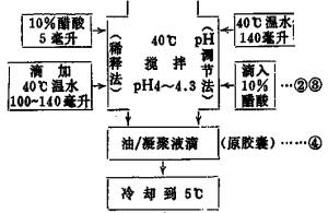 在研究微胶囊制造方法时,不仅针对制造方法,还需要考虑到微胶囊的使用方法,特别是内芯物如何放出的问题。 内芯物放出的方法有压力、电流、温度、气体、水分、溶剂、PH、生物酶等与物理的、化学的、生化的种种方法。内芯物放出的情况又可分为两种,即全量在短时间放出和类似慢性药品似的随着时间而逐步放出。 有关胶囊制造方法的报告很多。关于它的分类,有的是将内芯与外膜分开介绍,有的则按微胶囊形成原理分开介绍。现根据后一种分类方法,选择几种主要制造方法,介绍如下: 一、界面法 这是在不能混和的两种物质界面之间,使单体聚合,形成薄膜以制造徽胶囊的方法。例如在不能与水混和的油相中,预先溶入单体,油相再在水相中分散。另外在水相 中也加入另一种单体,在两相的界面上发生聚合,生成薄膜,制成以油相为内芯的微胶囊。应用这种方法无论亲水性或疏水性物都可制成内芯,如果与凝聚法结合使用,可以制成双层外膜的微胶囊。 可采用本方法的内芯物为染料、油脂、生物酶等;外膜可用聚酯胺、聚酯、聚氨酯等。 二、水相分离法 利用凝聚原理的制造方法也包括在本法内。 其原理是对溶解或分散在水中的成膜物质用适当方法引起相分离,包复内芯物,制成微胶囊。发生相分离的方法有温度与pH的操纵,加入能起相分离作用的药剂如乙醇、食盐等物。 能应用本法的内芯物是无碳素复写纸的染料与香油,香料等,种类很多,都是不能与水混和的物质,外膜物以明胶最好,其他如甲基纤维素、聚乙烯醇、乙基乙烯吡啶丙烯酸甲酯-甲基丙烯酸共聚物等等也被应用。 本法对液体或固体的内芯物都可应用,但不能用在水溶性和亲水性的内芯物。又应用本法可制成从数微米到数毫米的各种大小的微胶囊。 图1是应用本法制造微胶囊的一个举例。内芯物:橄榄油;外膜物:明胶、阿拉怕树胶。
