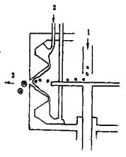 图2多孔旋转圆简法制造微胶囊装置示意图 1-内芯物;2-外膜物,3-到硬化装置。 资料来源:L.A.Luzzi.J.Pharm.Sci, 59(10),1367(1970) 五、静电法 本方法的原理是使两个粒子,分别各带有相反电荷,在静电力作用下,两个粒子相吸,成为一个整体。也就是将内芯物与外膜物各带相反电荷,在室气中喷雾后,通过静电作用,能使两种物质给合,形成微胶囊。 在应用本法的一个例子中,甘油用作内芯物,蜡质用作外膜物,分别使前者带正电荷,后者带负电荷。 此处也需使用特殊装置,图3便是这一种装置的模型图。